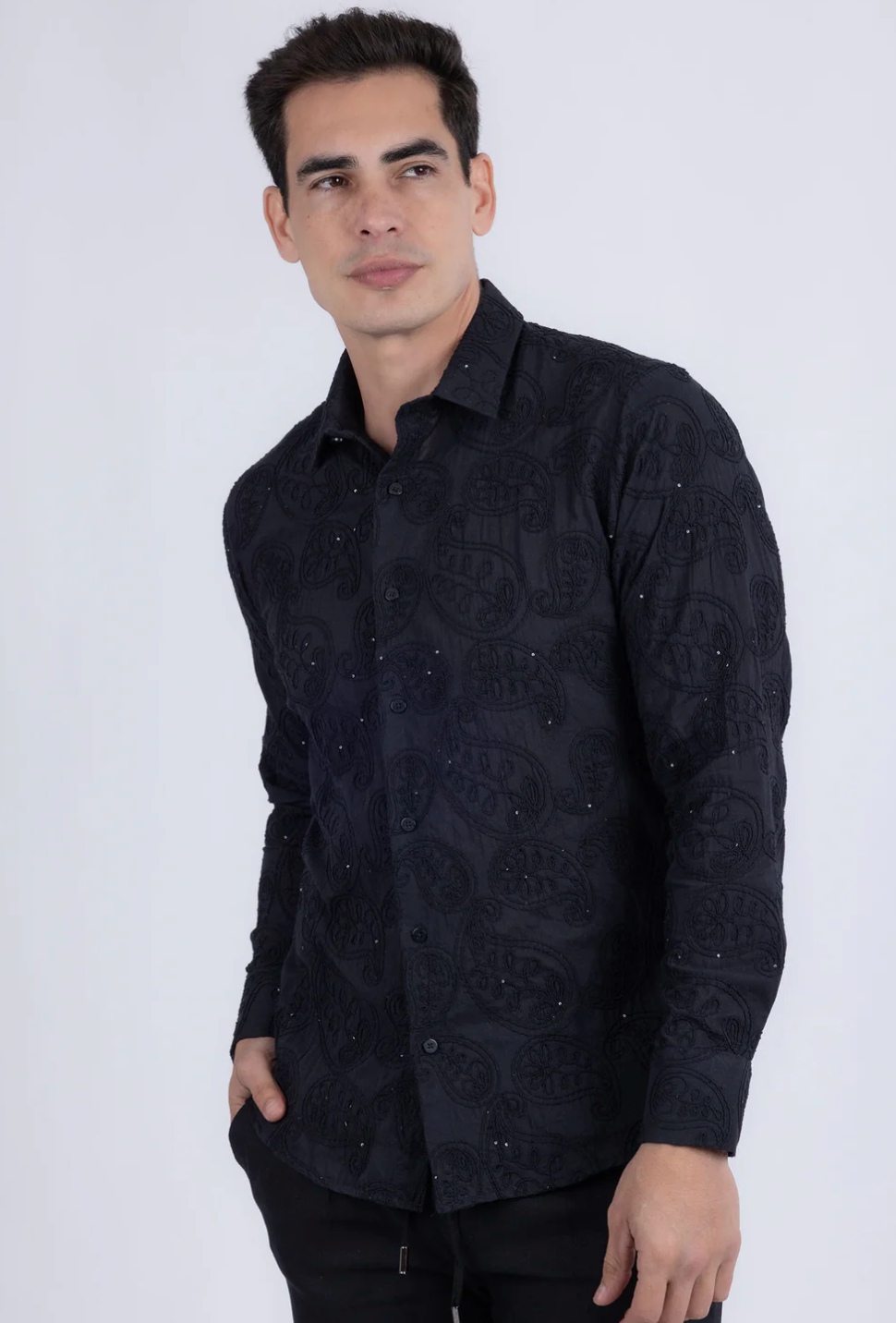 Discover refined elegance with the Hedged Embroidered men's Long Sleeve slim fit Shirt crafted for the modern man who values distinctive style. This sophisticated shirt features intricate geometric embroidery and shimmering sequin accents that command attention without compromising subtlety. Constructed from premium, lightweight fabric, it delivers exceptional comfort and breathability for all-day wear. Whether dressing for upscale events or elevated casual occasions, this expertly designed piece elevates any wardrobe with timeless contemporary flair and undeniable sartorial presence.